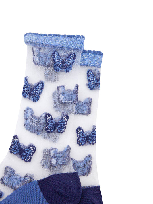 Butterflies Combed Cotton Sheer Pop Socks in Blue