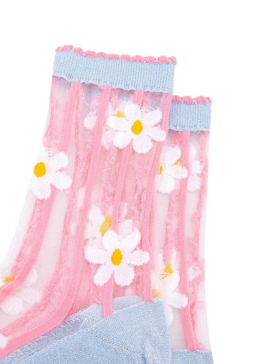 Daisy Stripes Combed Cotton Sheer Pop Socks in Blue/Pink