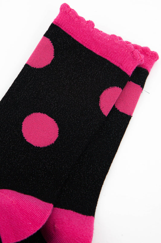 Polka Dot Cotton Glitter Socks Scalloped Cuffs Black Pink