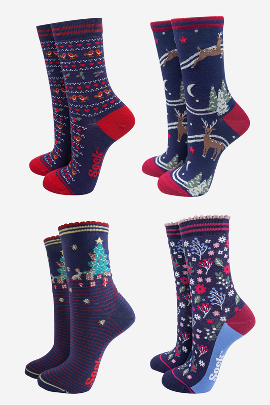 Women's Bamboo Ankle Socks Festive Gift Set - Navy Blue/Red, Woodland Animals