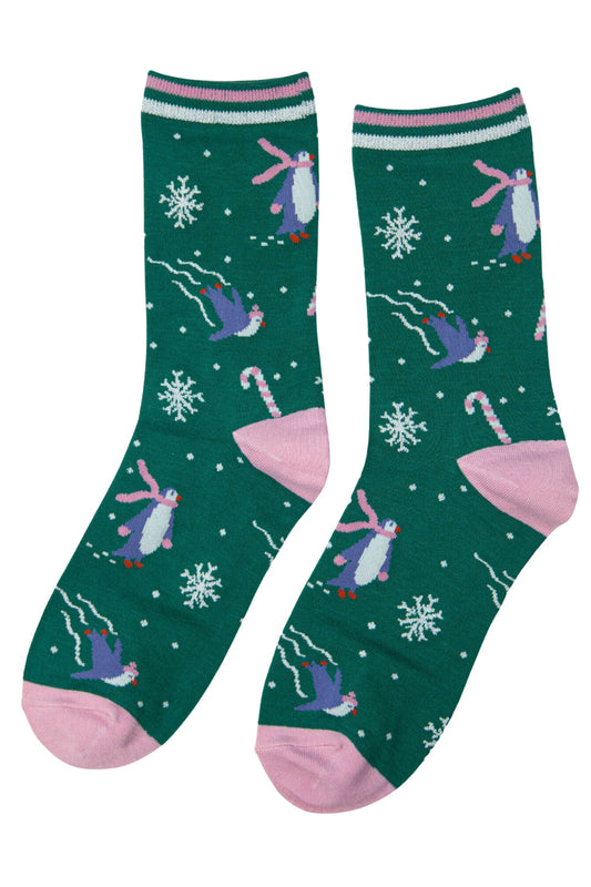 Women's Bamboo Glitter Christmas Socks Skating Penguin Green