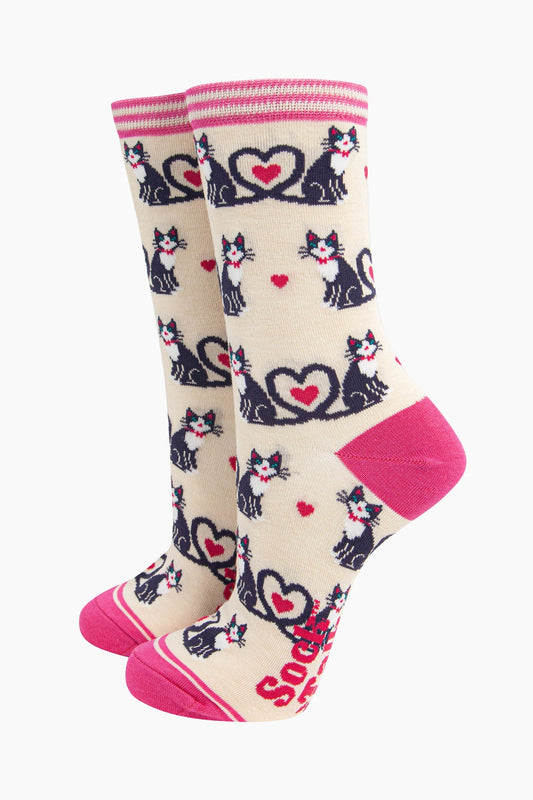 Women's Bamboo Socks - Cream, Cats Love Heart Tails