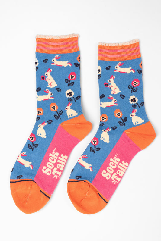 Women's Bamboo Socks - Blue, Rabbit and Flowers