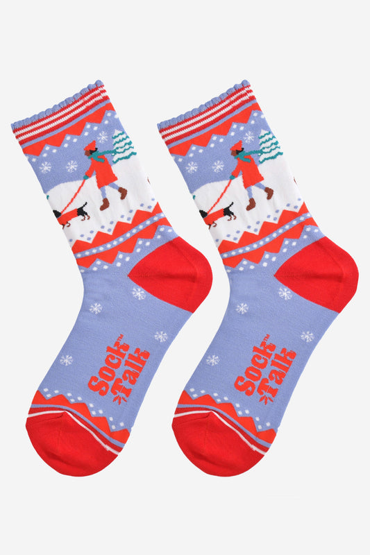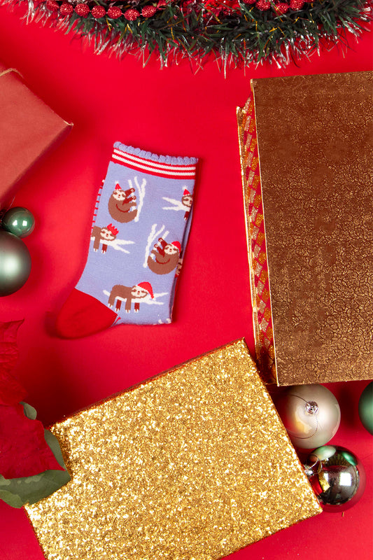 Women's Bamboo Socks - Blue/Red, Christmas Sloth