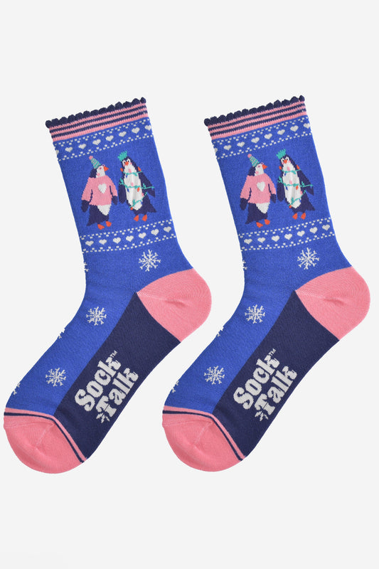 Women's Bamboo Socks - Blue/Pink, Party Penguin