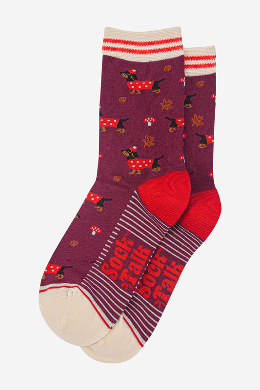 Women's Bamboo Socks - Berry/Cream, Sausage Dogs Toadstools