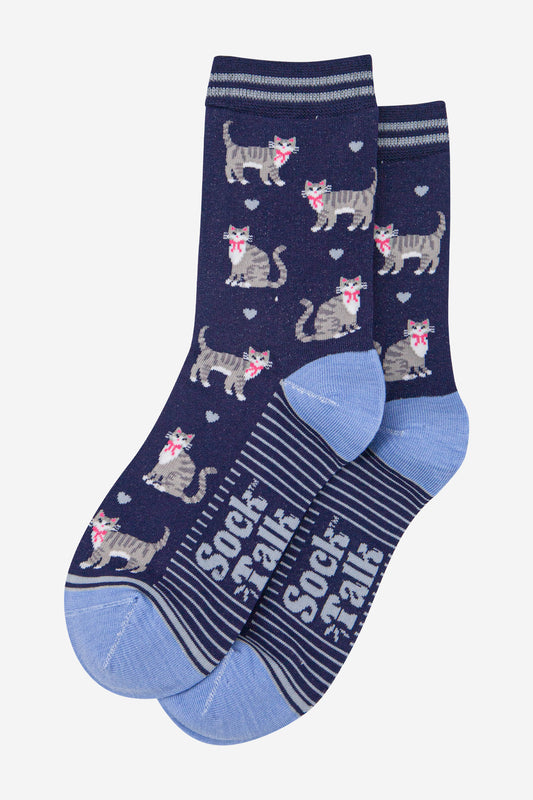 Women's Bamboo Socks - Navy Blue/Light Blue, Grey Tabby Cats
