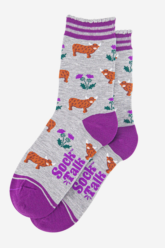 Women's Bamboo Socks - Light Grey/Purple, Highland Cow Thistles