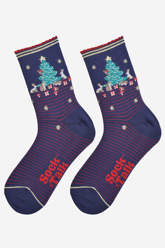 Women's Bamboo Socks - Navy Blue, Woodland Animals Christmas Tree