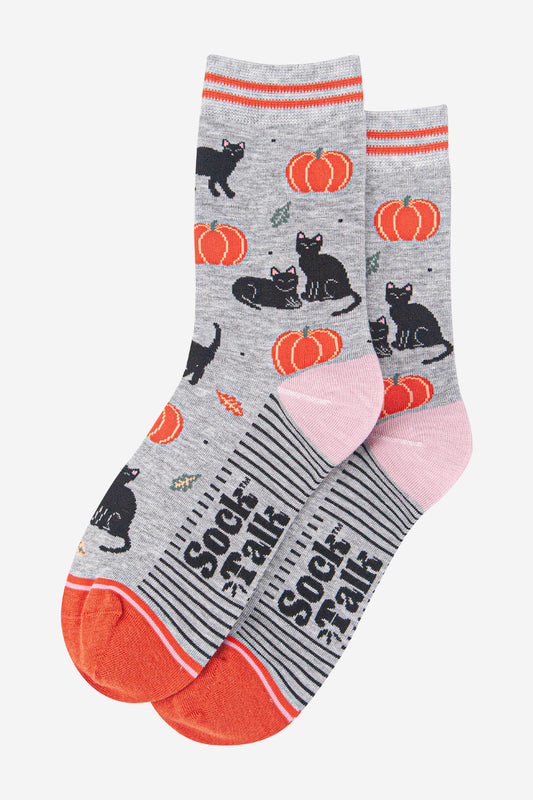 Women's Bamboo Socks - Light Grey/Orange, Cats and Pumpkins
