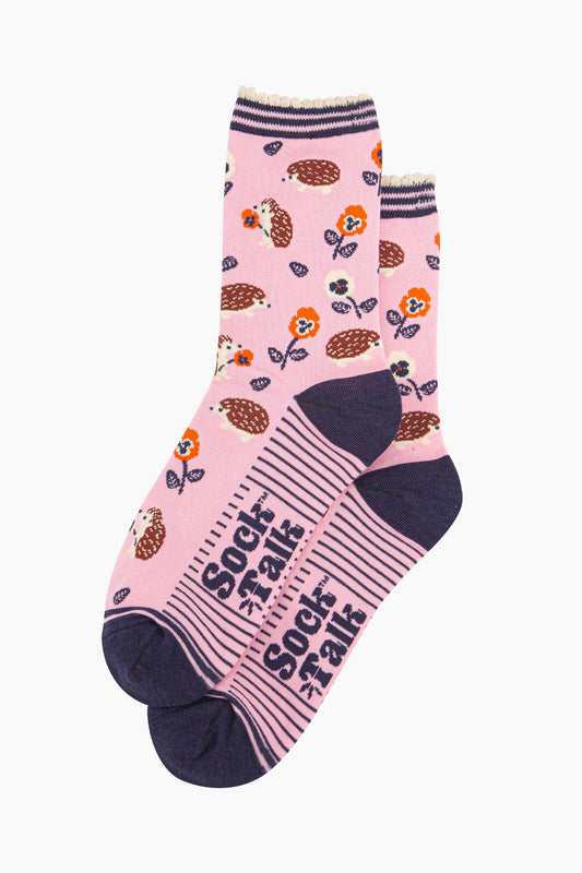 Women's Bamboo Socks - Pink, Hedgehog and Pansies