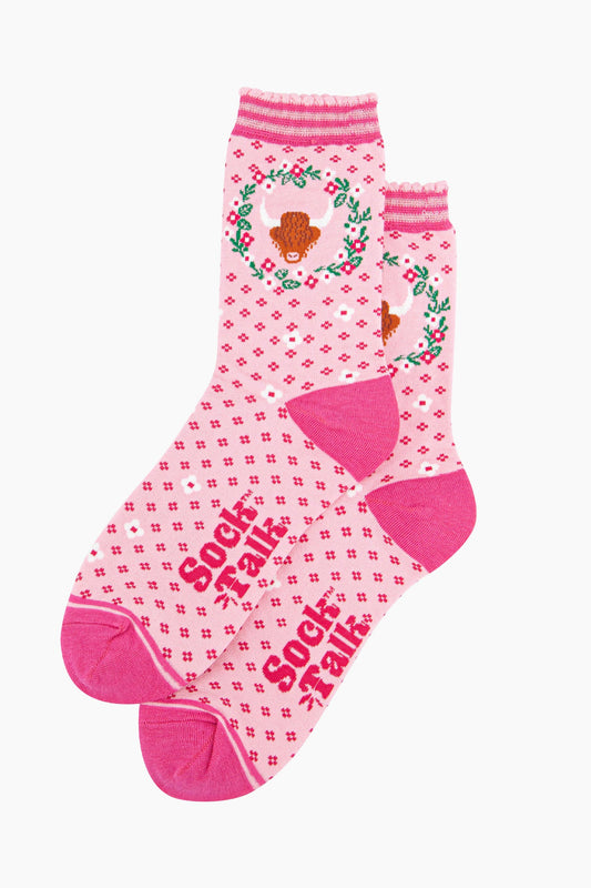 Women's Bamboo Socks - Pink, Highland Cow Wreath