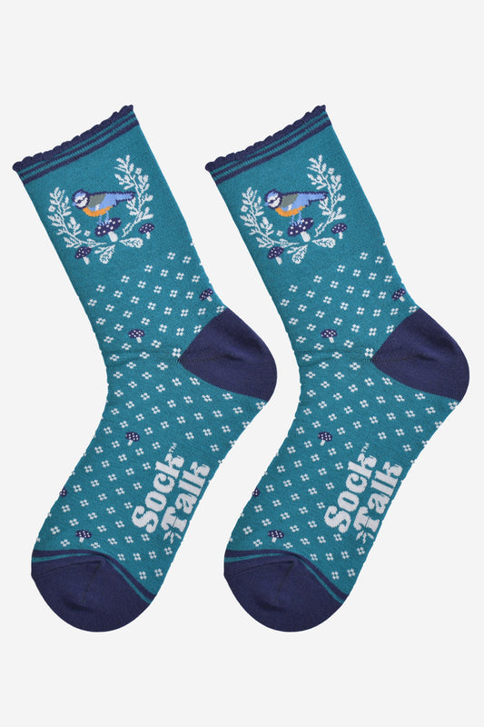 Women's Bamboo Socks - Teal/Navy Blue, Blue Tit Wreath