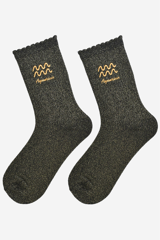 Women's Glitter Socks - Black/Gold, Zodiac Aquarius