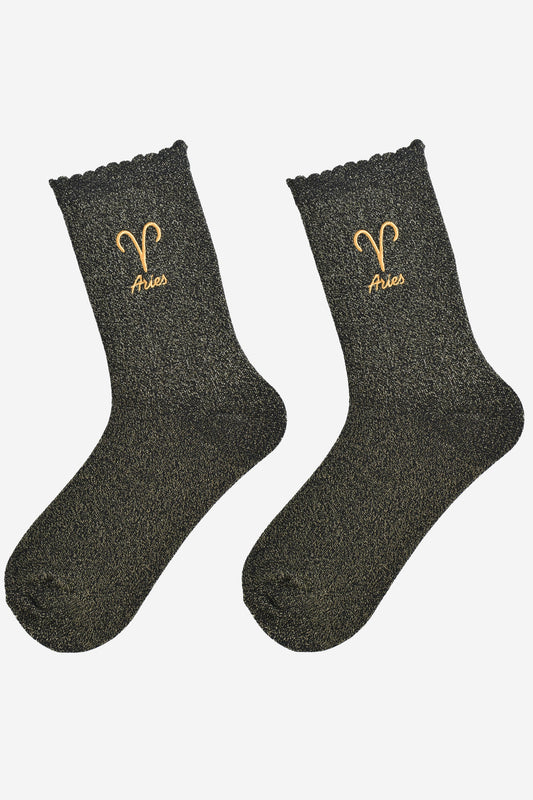 Women's Glitter Socks - Black/Gold, Zodiac Aries