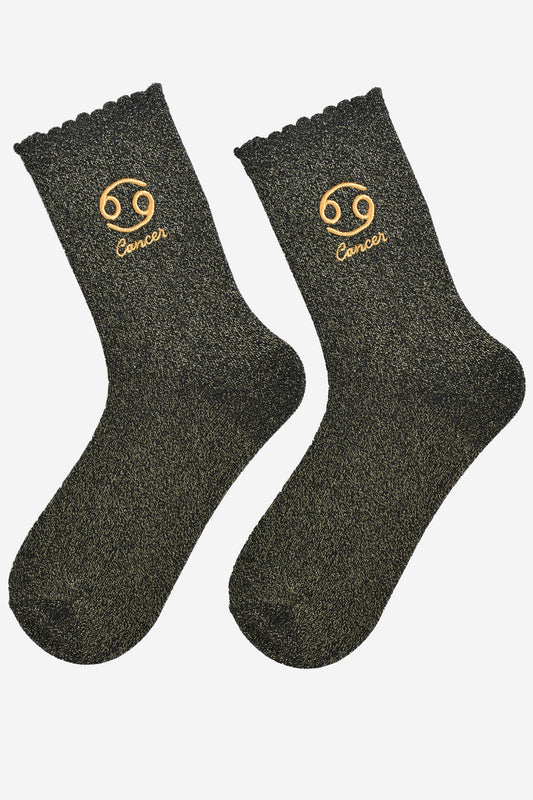 Women's Glitter Socks - Black/Gold, Zodiac Cancer
