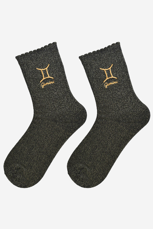 Women's Glitter Socks - Black/Gold, Zodiac Gemini