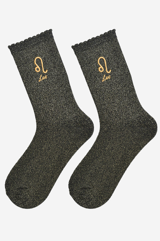Women's Glitter Socks - Black/Gold, Zodiac Leo