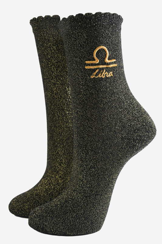Women's Glitter Socks - Black/Gold, Zodiac Libra