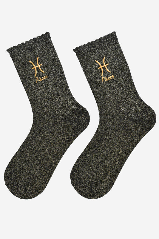 Women's Glitter Socks - Black/Gold, Zodiac Pisces