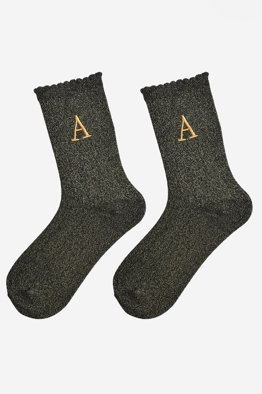 Women's Glitter Socks - Black/Gold, Initial "A"