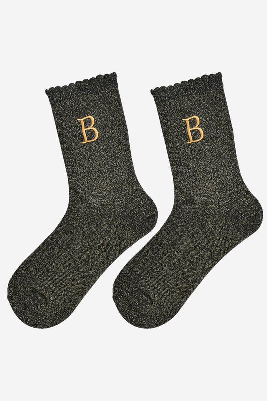 Women's Glitter Socks - Black/Gold, Initial "B"
