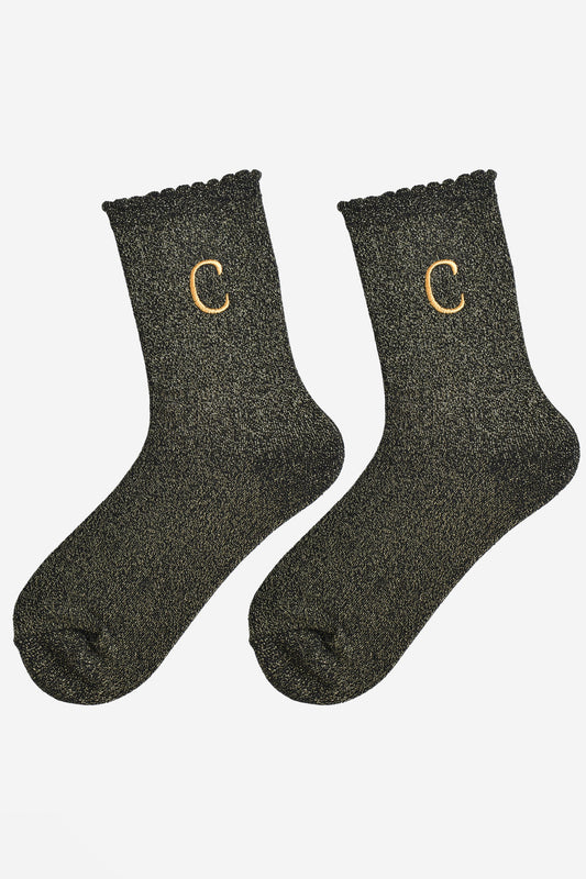 Women's Glitter Socks - Black/Gold, Initial "C"