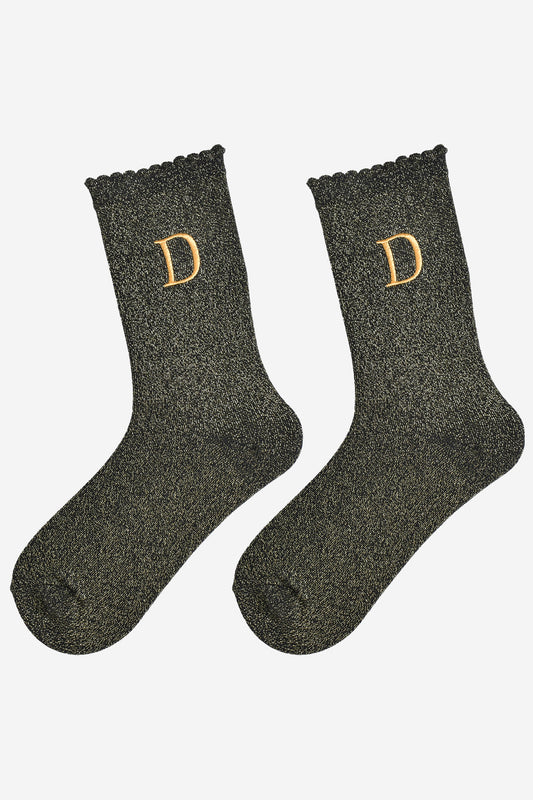 Women's Glitter Socks - Black/Gold, Initial "D"