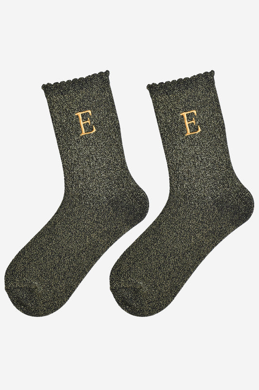 Women's Glitter Socks - Black/Gold, Initial "E"