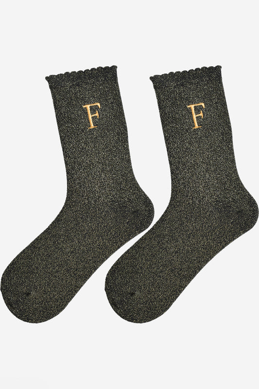 Women's Glitter Socks - Black/Gold, Initial "F"