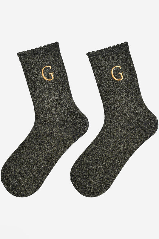 Women's Glitter Socks - Black/Gold, Initial "G"