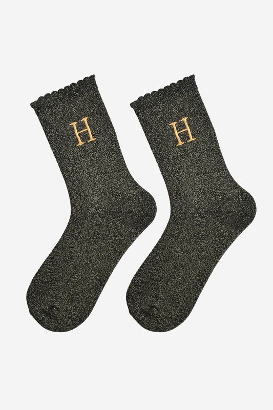 Women's Glitter Socks - Black/Gold, Initial "H"