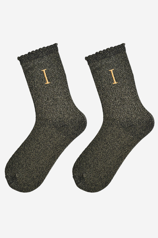 Women's Glitter Socks - Black/Gold, Initial "I"