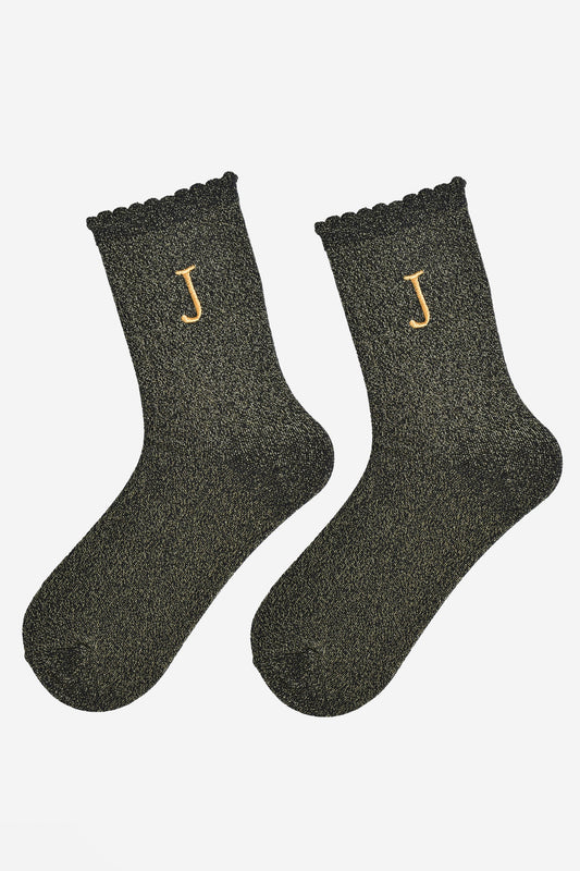 Women's Glitter Socks - Black/Gold, Initial "J"