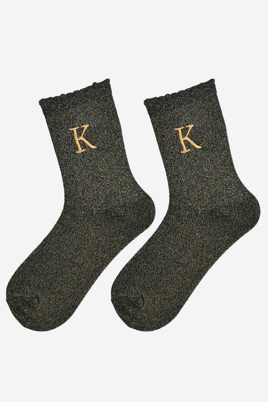 Women's Glitter Socks - Black/Gold, Initial "K"