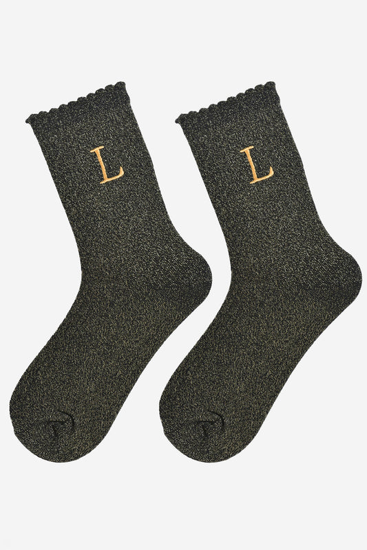 Women's Glitter Socks - Black/Gold, Initial "L"