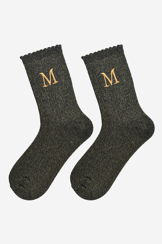 Women's Glitter Socks - Black/Gold, Initial "M"