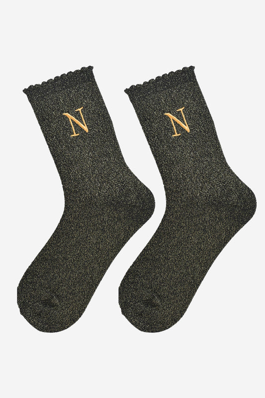 Women's Glitter Socks - Black/Gold, Initial "N"