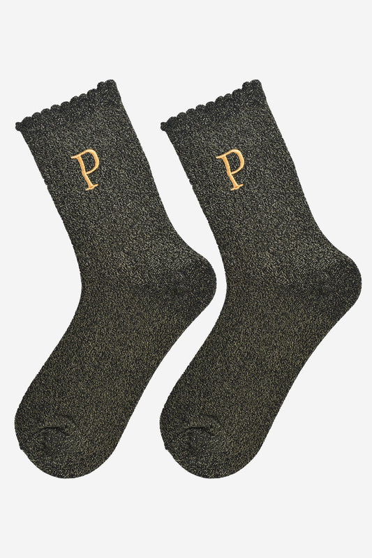 Women's Glitter Socks - Black/Gold, Initial "P"
