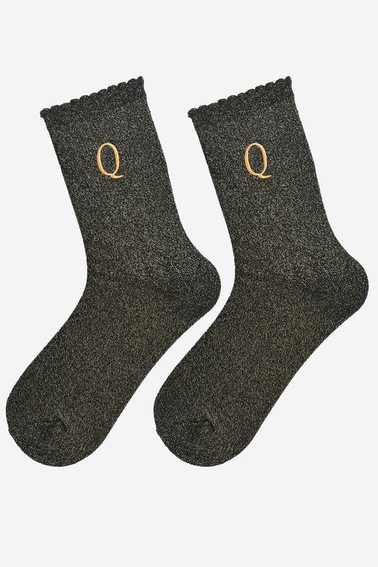Women's Glitter Socks - Black/Gold, Initial "Q"
