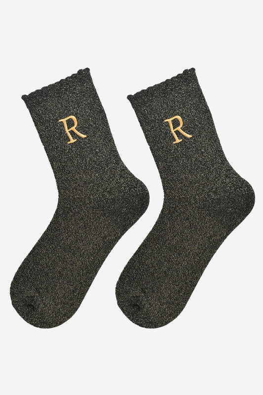 Women's Glitter Socks - Black/Gold, Initial "R"