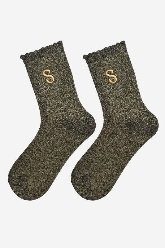 Women's Glitter Socks - Black/Gold, Initial "S"