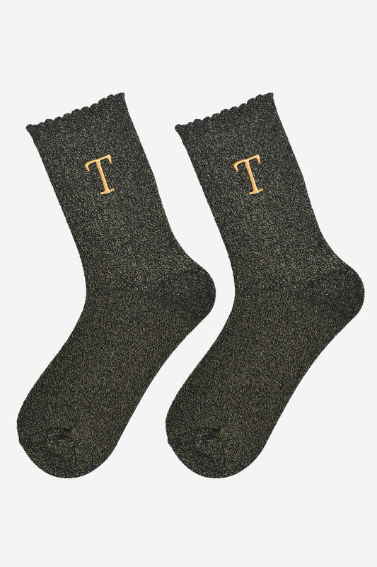 Women's Glitter Socks - Black/Gold, Initial "T"