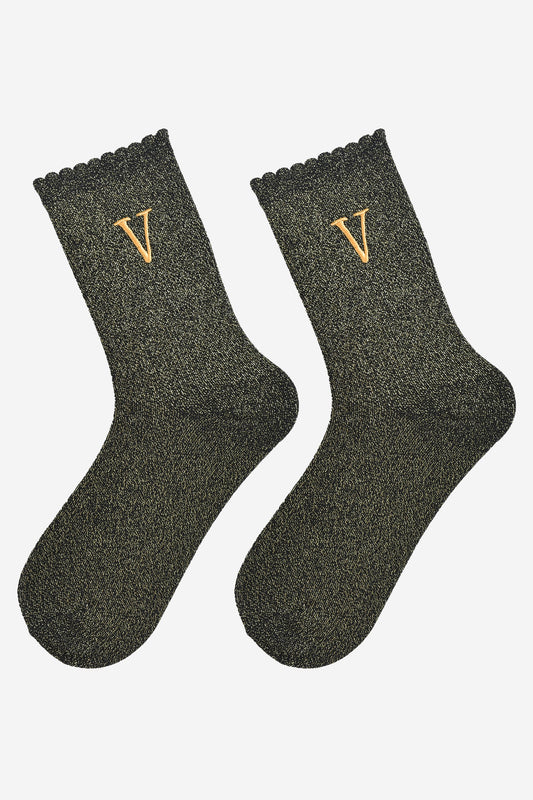 Women's Glitter Socks - Black/Gold, Initial "V"