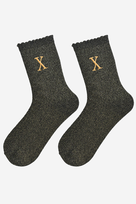 Women's Glitter Socks - Black/Gold, Initial "X"