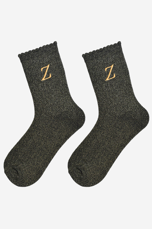 Women's Glitter Socks - Black/Gold, Initial "Z"
