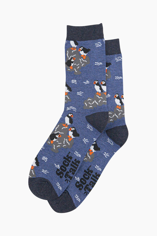 Men's Bamboo Socks - Denim Blue, Puffins On Rocks