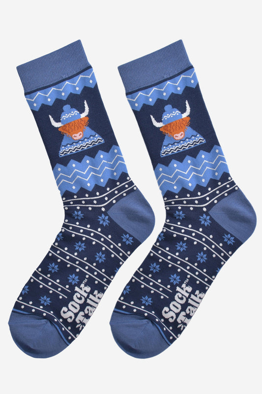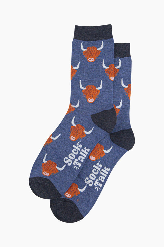 Men's Bamboo Socks - Denim Blue, Highland Cow