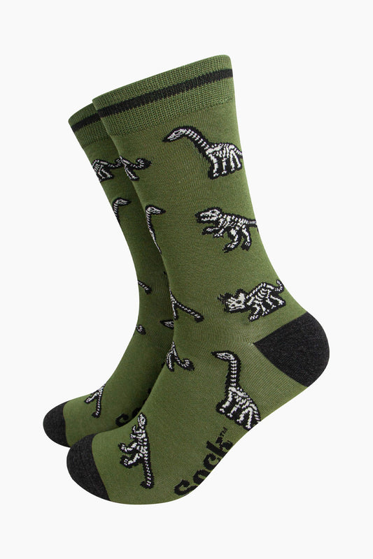 Men's Bamboo Socks - Green, Dinosaur Skeletons