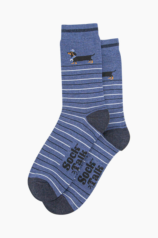 Men's Bamboo Socks - Denim Blue, Sausage Dog Sailor Stripe